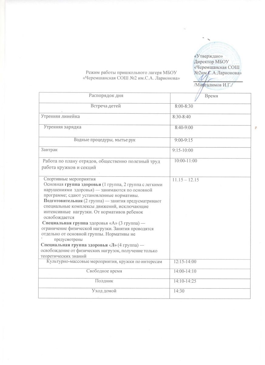 Режим дня пришкольного лагеря "Ромашка"