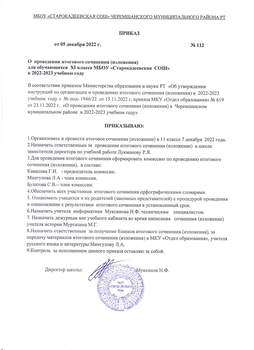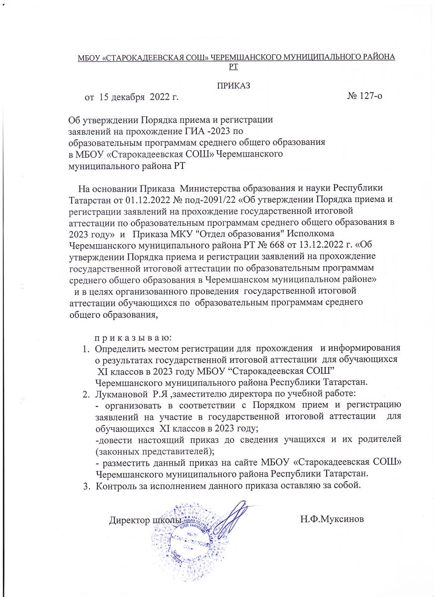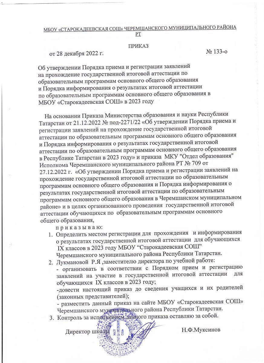 Приказ МБОУ "Старокадеевская СОШ" "Об утверждении порядка приема и регистрации заявлений на прохождении государственной итоговой аттестации по образовательным программам основного общего образования и Порядка информирования о результатах государственной итоговой аттестации по образовательным программам основного общего образования в МБОУ "Старокадеевская СОШ" в 2023 году"