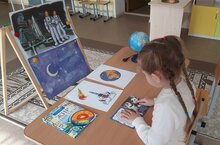 12 апрель Космонавтика көне уңаеннан балалар белән бергә галәм киңлекләрен иң беренче иңләгән Белка һәм Стерлка турында кызыклы мәгълүматлар укыдык ,беренче космонават Юрий Гагринның торыш юлы белән кыскача таныштык.Галәм киңлекләренен ачылмаган сереле якларының да куп булы турында сөйлштек.Соңыннан балалар узләренең кичерешләрен рәсемгә төшерделәр.