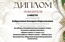 Республика күләм "Җанлы сүз" шигыр уку бәйгесендә икенче урын алган Хайруллина Иллариягә (3 яшь) киләчәктә дә уңышлар теләп калабыз.