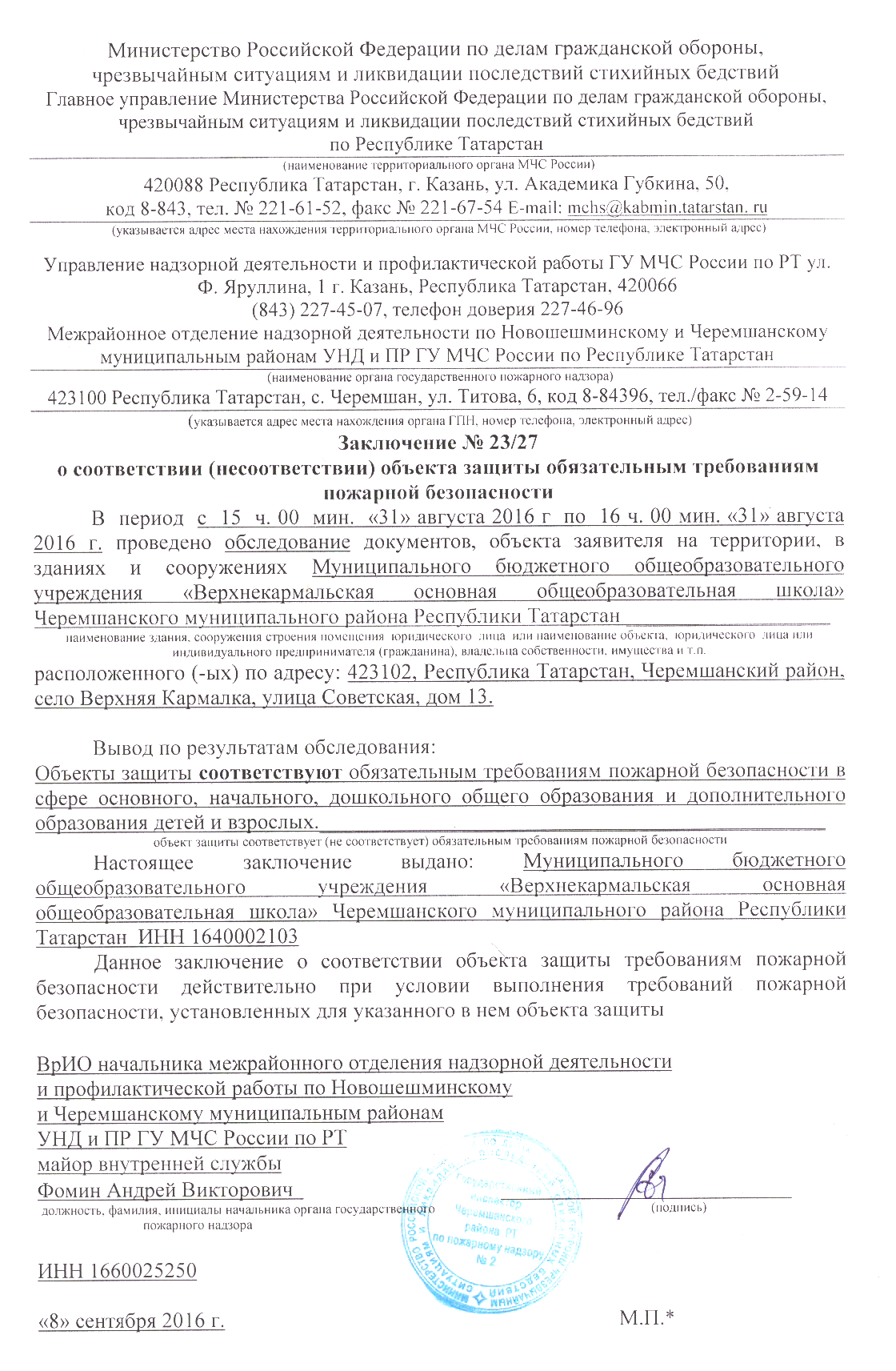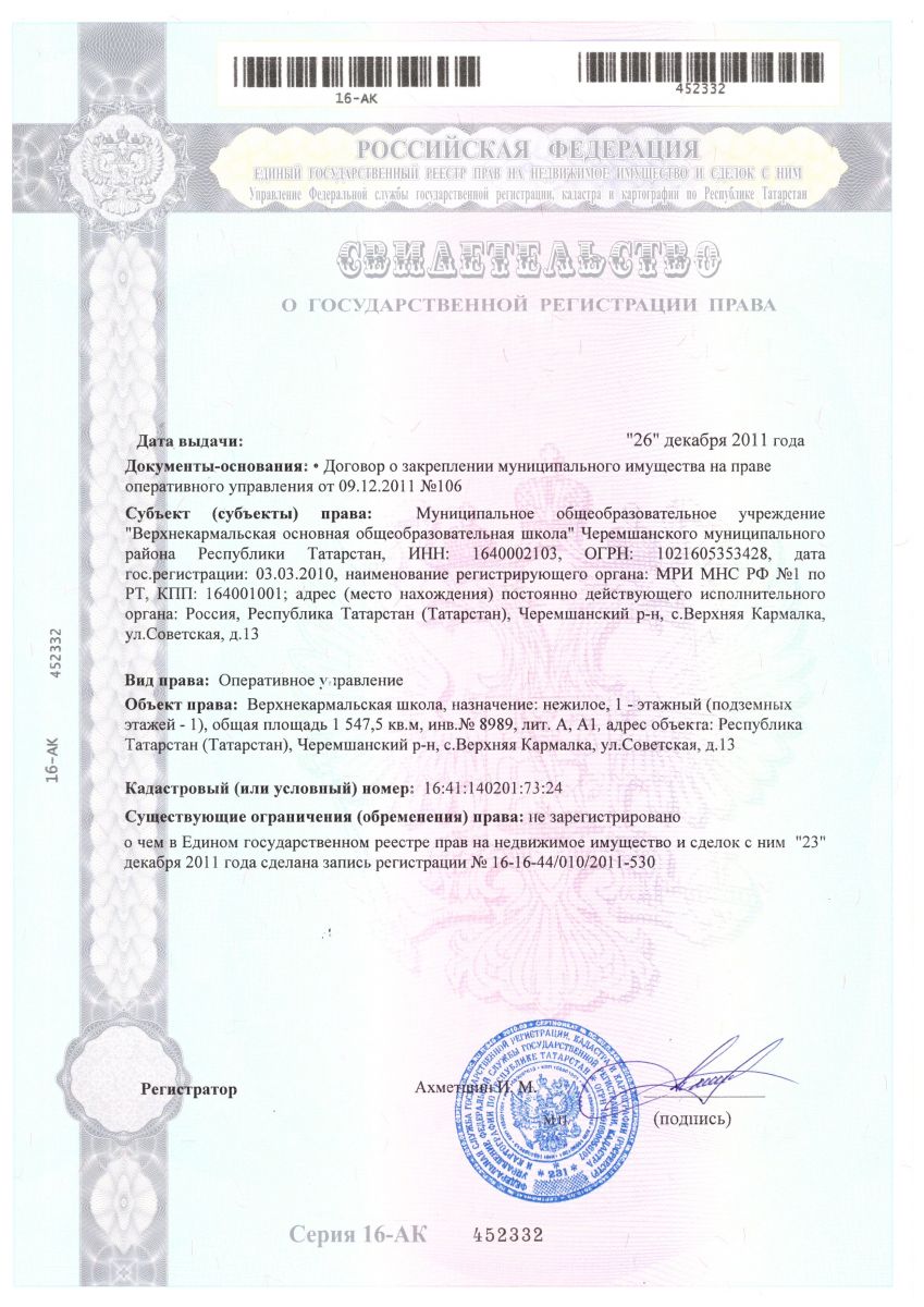 | Адрес: | 423102, Республика Татарстан, Черемшанский район, с. Верхняя Кармалка, ул. Советская, д. 13 |