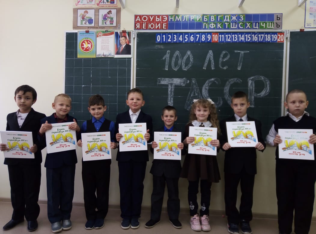 Беренче сыйныф укучыларына бүләк! ТАССР төзелүнең 100 еллыгы уңаеннан 1 нче сыйныф укучыларына китаплар тапшырылды, анда тарихи мәгълүматлар, язмалар, уеннар, кул эшләре макетлары, буяу урнаштырылган.