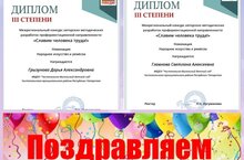 Педагоги нашего детского сада, Грызунова Д.А. и Главнова С.А., приняли участие в межрегиональном конкурсе авторских методических разработок профориентационной направленности "Славим человека труда!" в номиции "Народное искуство и ремёсла" и заняли почётное 3 место!