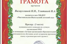Муниципальный семинар – практикум по теме «Организация образовательной деятельности по обучению детей двум государственным языкам РТ в соответствии ФГОС ДО» по итогам муниципального конкурса на лучшую организацию образовательной деятельности по обучению детей двум государственным языкам РТ на базе МБДОУ «Детский сад №14» «Подсолнушек». Педагоги Валиуллина Н.Н. и Улитина Н.А стали призёрами (3 место). Поздравляем коллег и желаем дальнейших успехов!