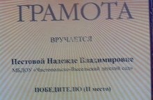 Педагог Пестова Н.В. стала победителем ( II место ) в номинации "Приобщение к искусству" муниципального смотра-конкурса за лучшую разработку дидактической игры/ пособия.