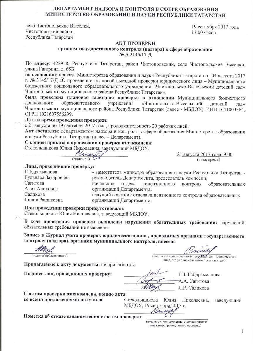Акт проверки органом государственного контроля(надзора) в сфере образования № 3145/ 17 -Д от 19.09.2017 года Акт.jpg