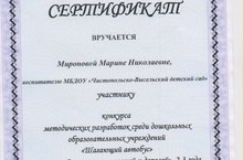 Воспитатель Миронова М.Н. получила сертификат за участие в муниципальном конкурсе методических разработок "Шагающий автобус" по теме "Знакомство с улицей и дорогой" с детьми 2-3 лет.
