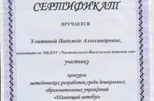 Воспитатель старшей группы Улитина Н.А. получила сертификат за участие в муниципальном конкурсе методических разработок "Шагающий автобус" по теме "Экскурсия к остановке общественного транспорта" с детьми 5-6 лет