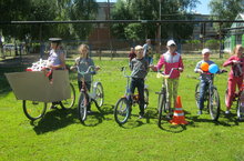В пришкольном лагере "Солнышко" прошла спортивная эстафета на велосипедах. Этафета состояла из следующих этапов: "Быстрая езда", "Змейка", "Перевозка грузов" и др.