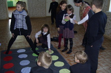 Ребята начальных классов весело играют на переменах в игру ТВИСТЕР.