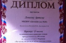 Подведены итоги муниципального конкурса чтецов по произведениям С.Я Маршака, организованного ресурсным центром "В таланты с малых лет". По итогам конкурса наш воспитанник , Донеев Артём, стал призёром в своей возрастной номинации. Поздравляем! Желаем дальнейших творческих успехов и побед!!!