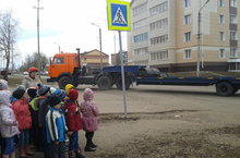 Воспитанники старшей и подготовительной группы наблюдали за движением транспорта и пешеходов на перекрёстке ул.Вахитова и К.Либнехта, гду установлен новый дорожный знак - пешеходный переход.