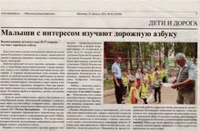 Статья называется "Малыши с интересом изучают дорожную азбуку". Акция "Правила движения достойны уважения" традиционно проводится в детском саду совместно с инспектором ГИБДД Владиславом Вотяковым и начальником филиала "Дирекция финансирования программ безопасности дорожного движения Республики Татарстан" Светланой Сидоровой. Дети с удовольствием напоминали взрослым пешеходам о необходимости соблюдать правила дорожного движения. Малыши дарили свои рисунки о ПДД. Взрослые были приятно удивлены встречей с юными инспекторами движения и с благодарностью принимали их напутствия.