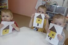 Наши малыши очень ждут птичек и готовят для них скворечники! Дети старались изобразить в аппликации предметы, состоящие из нескольких частей; определяли форму частей (прямоугольная, круглая и треугольная), уточняли знание основных цветов, развивая при этом цветное восприятие. -