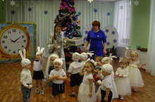 Дети зажигали елку , читали стмхи вместе и пели песни. В гости к детям вбежал Заяц - мальчики с ним танцеввали, приходил Мишка -топтыжка - дети играли с ним в игру "Мишка ходит в гости" и приходила Снегурочка - девочки исполнили танец снежинок. В заершение утренника снегурочка и дети исполнили танец со снежинкамм и игру со снежинками. Снегурочка не забыла , принесла с елкой она к детям пришла. А на ветках , а на ветках не игрушки, а конфетки.