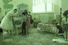 Весь утренник дети пели песни и танцевали. К детям приходили сказочные персонажи Волк,Заяц, Снежная Королева, Лягушки.