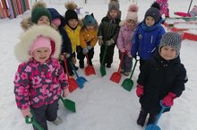 Кыш-актив йөрү өчен менә дигән вакыт. "Радуга" төркемендә тәрбияләнүчеләр ачык һавада йөрергә бик яраталар! Кыш көне җәяү йөргәндә балалар рәхәтләнеп игелекле эшләр эшлиләр: биналарны кардан чистарталар һәм үзләрен "Кечкенә тылсымчылар"итеп тоялар.