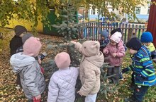 Очередная познавательная прогулка прошла для ребят средней группы "Звездочки". Объектом для рассматривания стали красавицы-елочки, как говорится от мала до велика, такое разнообразие можно увидеть на территории нашего детского сада. Дети узнали, чем отличаются елки от других деревьев, рассмотреть их хвою, шишки и строение. Ребята спели песню про ёлочку, почистили ее хвоинки от сухой листвы.
