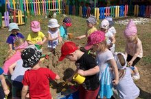 Балалар бакчасы территориясен яшелләндерү балалар белән берлектә уңай нәтиҗә бирә һәм балалрны коллективтаа үзара хезмәттәшлеккә өйрәтә. Шулай итеп "Знайки" төркеме участогында чәчәк ата торган үсемлекләр белән үзенчәлекле тау пәйда булды.