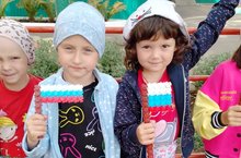 «Елмаю» төркеме тәрбияләнүчеләрен Россия Федерациясе флагы белән таныштырдылар. Үз илләре турында башлангыч белем бирделәр. Балаларны флагның тәэсирле образын булдырырга, эшендә өч төстәге колорны кулланырга, кызыл, зәңгәр, ак төсләрне ныгытырга өйрәтәләр. Күзаллауны үстерделәр, дөрес итеп утыралар, полоскага клей салалар, флаг төсләрен дөрес тәртиптә урнаштыралар. Патриотизм, илебез флагына хөрмәтле мөнәсәбәт тәрбиялиләр.