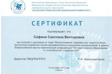 Старший воспитатель - С.В. Сафина выступила по теме «Использование современных педагогических технологий в развитии логико-математического мышления дошкольников» в рамках Всероссийской научно-практической конференции «Математическое образование: от способностей к одаренности», организованной ПМЦ ПКиПП РО ФГАОУ ВО «Казанский (Приволжский) федеральный университет»