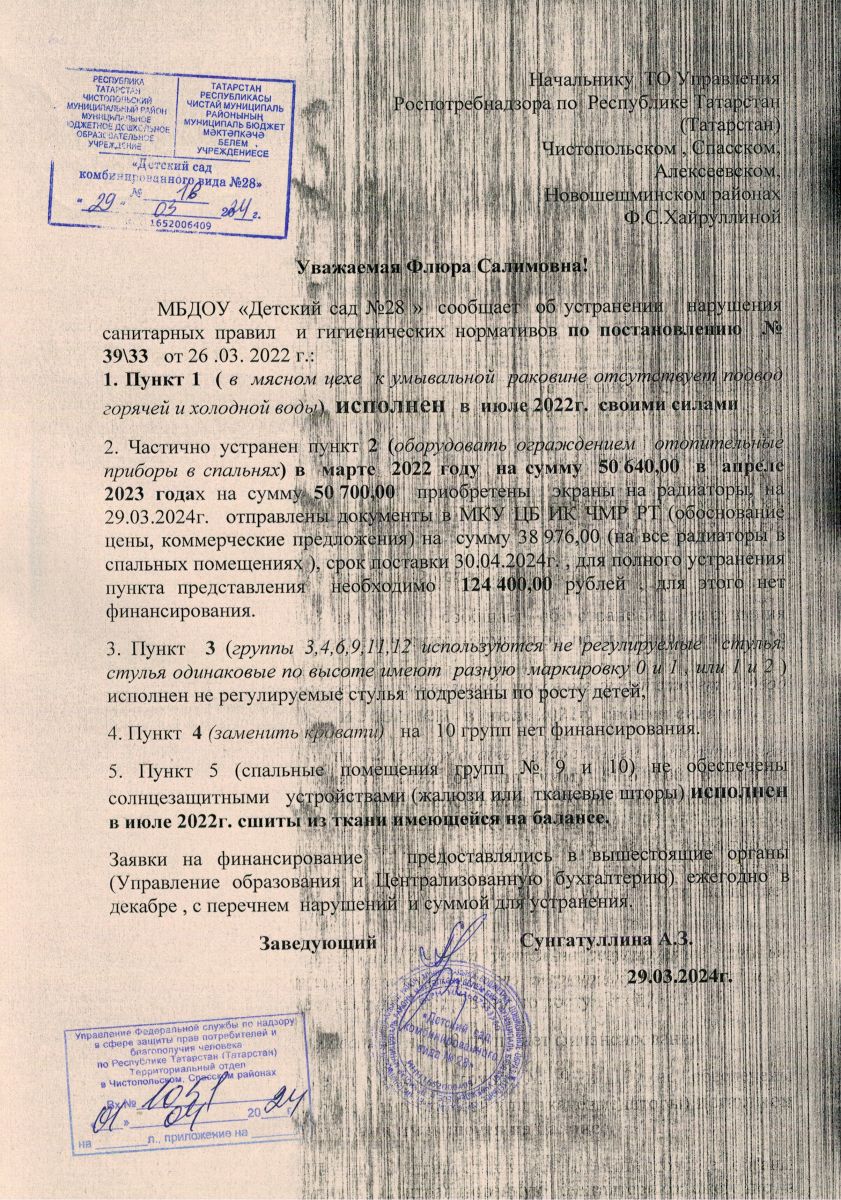 Отчёт об устранении нарушений санитарных правил и гигиенических нормативов по постановлению № 39/33 от 26.03.2022 год