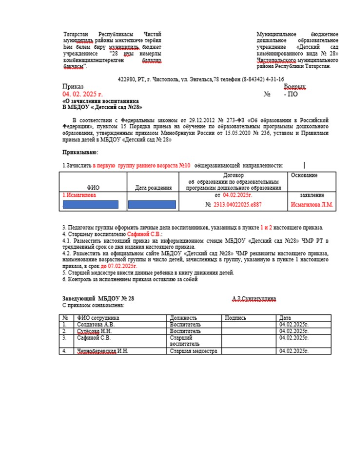 Приказ "О зачислении воспитанника В МБДОУ "Детский сад №28" от 04.02.2025 год