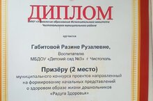 Поздравляем Габитову Р. Р., Призёра (2место) муниципального конкурса проектов направленного на формирование начальных представлений о здоровом образе жизни дошкольников "Радуга Здоровья".
