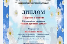 "Безнең дустанә гаилә"диеп исемләнгән Бөтенроссия конкурсында "Кулинар шедевр" номинациясендә Вәлиуллина Аишаны ҖИҢҮ белән тәбриклибез! Ярдәмче-педагоглар :Вафина Г.Н., Габитова Р.Р.. Киләчәктә дә иҗади уңышлар телибез!