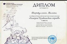 Наша воспитанница Шарифуллина Малика стала победителем Всероссийского детского конкурса рисунков "Галерея Пушкинских героев". Педагог: Габитова Р.Р.
