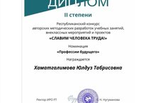 Поздравляем педагога Хаматгалимову Ю.Т. с участием и дипломом II степени Республиканского конкурса авторских методических разработок учебных занятий, вне классных мероприятий и проектов "Славим человека труда!"