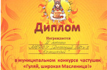 Безнең балалар бакчасы "Йөреш, киң Масленица" такмакларының муниципаль конкурсында 2 урын алган өчен диплом белән бүләкләнде.