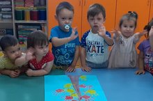 "Солнышки" группасы нәниләре күмәк эш ,"Көзге агач", куллар белән ясадылар, чәчәкләрне сары hәм кызыл төсләргә беркетеп, бик күп үңай эмоцияләр алдылар.