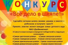 Лето - прекрасная пора для полета вашей фантазии, воплощения творческих идей, креативных решений. В детском саду объявлен конкурс "Все дело в шляпе", в котором могут принять участие все желающие. Итогом конкурса станет мероприятие с детьми, где состоится показ авторских моделей шляпок.