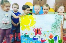 Слова всем знакомой с детства песенки стали темой коллективной работы малышей из группы №5. Все с нетерпением ждут жарких летних дней, а пока для настроения - вот такая яркая картина, основным инструментом создания которой являются ....детские ладошки!