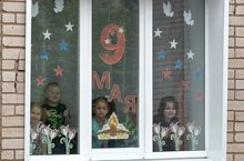 Ребята вместе с воспитателями оформили окна группы символами Победы — звёздами, гвоздиками, ьюльпанами и голубями мира