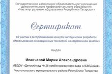 Восемнадцать педагогов детского сада стали участниками Республиканского конкурса методических разработок "Использование инновационных технологий на современном занятии". Все педагоги -участники получили сертификаты. 30.09.2014