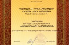 Две работы, подготовленные педагогами нашего детского сада, были оценены по достоинству. Победителями конкурса стала игра, созданная воспитателем Новиковой Н.Н. и учителем-дефектологом Салеевой О.Б., призером конкурса стала игра музыкального руководителя Карповой А.С.