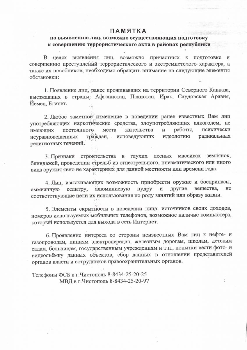 Памятка по выявлению лиц, возможно осуществляющих подготовку к совершению террористического акта в районах республики