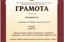Наши педагоги Сираева М.И и Фатхутдинова Л.Т приняли активное участие в муниципальном конкурсе методических разработок, посвященный 130-летию Габдулы Тукая, заняли призовое 2 место. Желаем дальнейших творческих успехов!