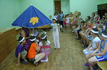 Инсценировка сказок, посвящена дню сказочных затей и народных традиций. Каждый отряд представил свой интересный вариант: отряд «Пчелки»- сказку «Грибок», Отряд «Лучики»- «Репка»,отряд «Радуга»- «Сказка рыбаке и рыбке», отряд «Подсолнушки»- «Теремок», Отряд «Веснушки»- «Каша из топора». Первое место заняли отряды «Пчелки» и «Веснушки», второе -«Лучики» и«Радуга», третье-«Подсолнушки».