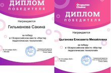 Туган (татар) теле һәм әдәбияты укытучылары Гыйльманова С.М. һәм Цыганова Е.М. "Ачык мәктәп" платформасы үткәргән "Педагогик технологияләр мастеры" дип аталган квестта җиңүче исеменә лаек булдылар. Аларны җиңүләре белән котлыйбыз һәм уңышлар телибез!