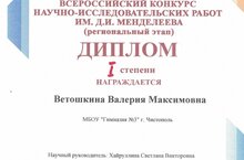Поздравляем Ветошкину Валерию, ученицу 8 класса и учителя Хайруллину С.В. с победой во всероссийском конкурсе научно-исследовательских работ им. Д.И. Менделеева (региональный этап) . Молодцы!