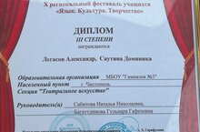 Учащиеся нашей гимназии приняли активное участие в X региональном фестивале учащихся «Язык. Культура. Творчество» в секции «Театральное искусство». Дипломом 1 степени награждена Луконина Дарья, ученица 9а класса, дипломом 3 степени награждены Легасов Александр, ученик 7 класса и Саутина Доминика, ученица 9 класса. Поздравляем ребят и их учителей Хайруллину С.В., Сабитову Н.Н., Багаутдинову Г.Г.