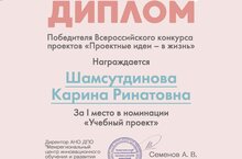 Поздравляем победителя в номинации «Учебный проект» Всероссийского конкурса проектов «Проектные идеи - в жизнь» Шамсутдинову Карину, ученицу 8 класс и ее учителя Назарову М.А. Дальнейших творческих успехов!