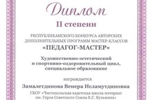 Замалетдинову Венеру Исламутдиновну - дипломанта II степени Республиканского конкурса авторских дополнительных программ мастер-классов "ПЕДАГОГ-МАСТЕР"