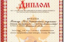 Команду ГБОУ "Чистопольская кадетская школа-интернат" и руководителя учителя ОБЖ Коноплева М.В. с I МЕСТОМ в муниципальном военно-патриотическом конкурсе "Служу России"
