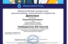 Наумову Елизавету, ученицу 3 класса, с победой во Всероссийском конкурсе «Медалинград», номинация «Литературное творчество».