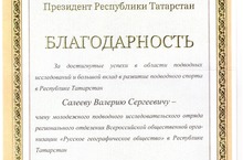 объявляется САЛЕЕВУ ВАЛЕРИЮ СЕРГЕЕВИЧУ за достигнутые успехи в области подводных исследований и большой вклад в развитие подводного спорта в Республике Татарстан