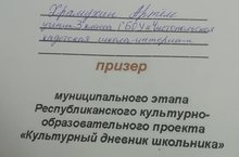 Ученик 3 класса Храмухин А. стал призером в муниципальном этапе Республиканского образовательного проекта "Культурный дневник школьника". Молодец, так держать!